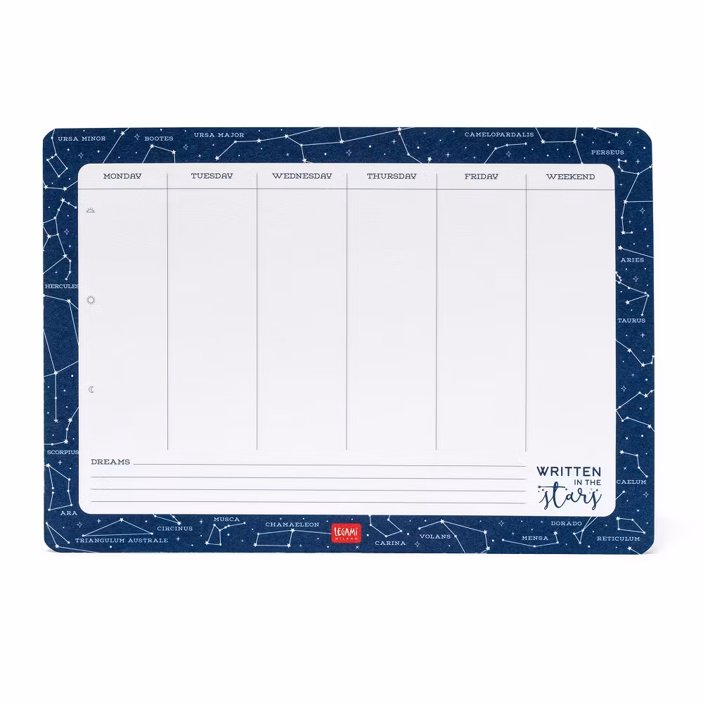 Smart veckoplanerare där du fyller i vad du har att göra, eller vad för mat som ska lagas varje dag. Kanske schema eller hur många kärleksbrev du ska skicka eller har fått.