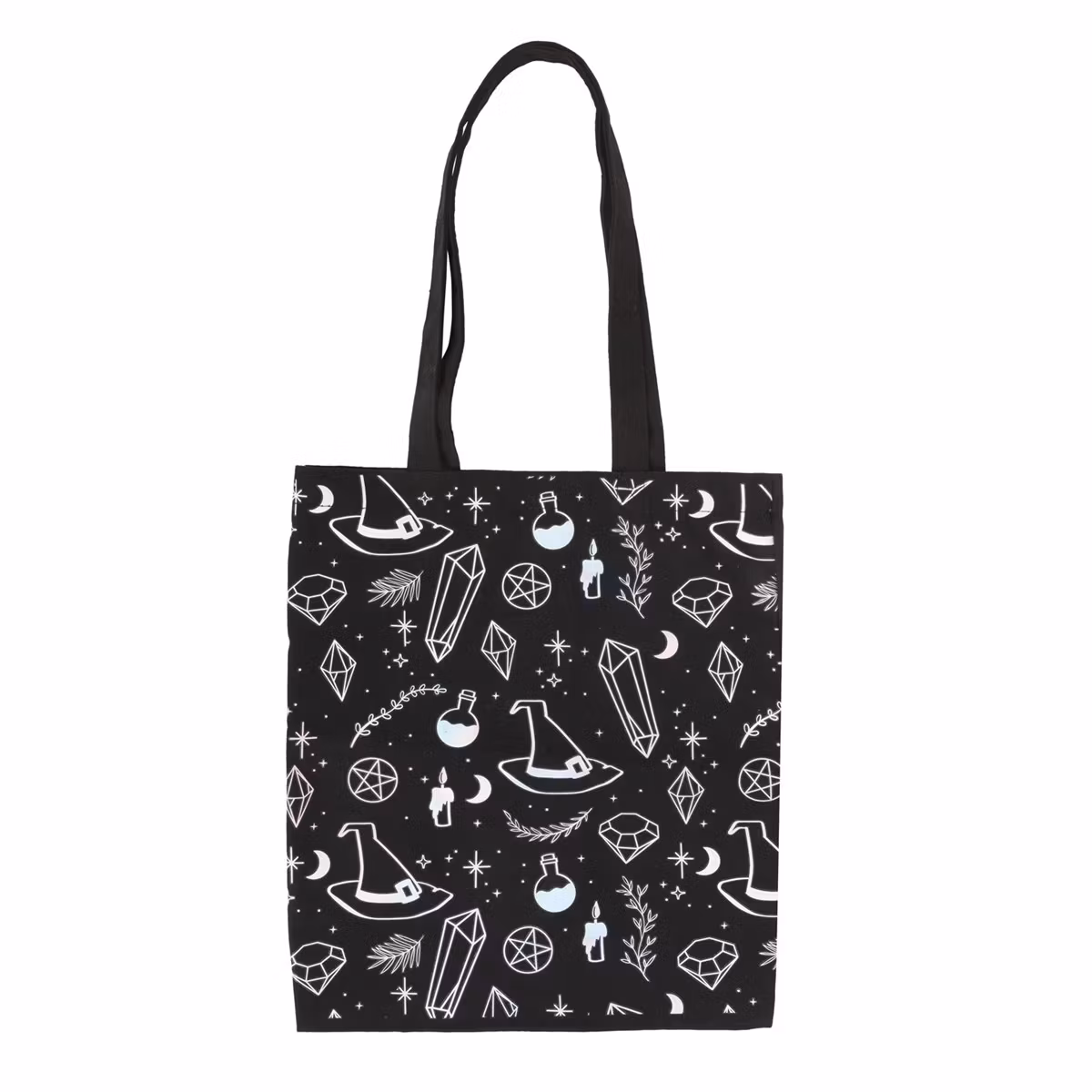 Dekorerad med motiv av kristaller, häxhattar och magiska brygder på en svart polycotton-canvas.