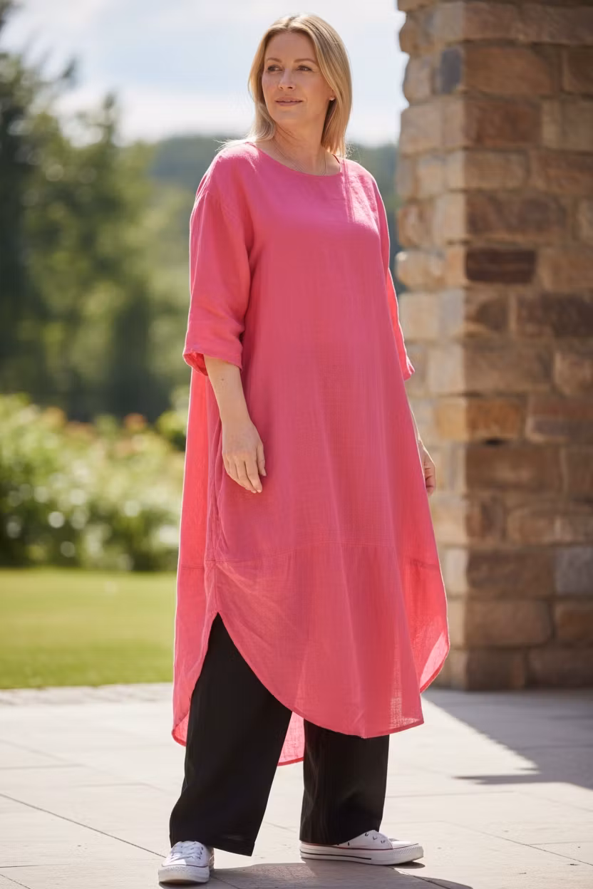 En lång modell med rundning nertill. Ärmarna kan du välja att ha längd på, eller om du vill vika upp dem. Rund hals och det absolut viktigaste av allt - Klänningen har fickor! Det måste vara bland det absolut viktigaste på klänningar.