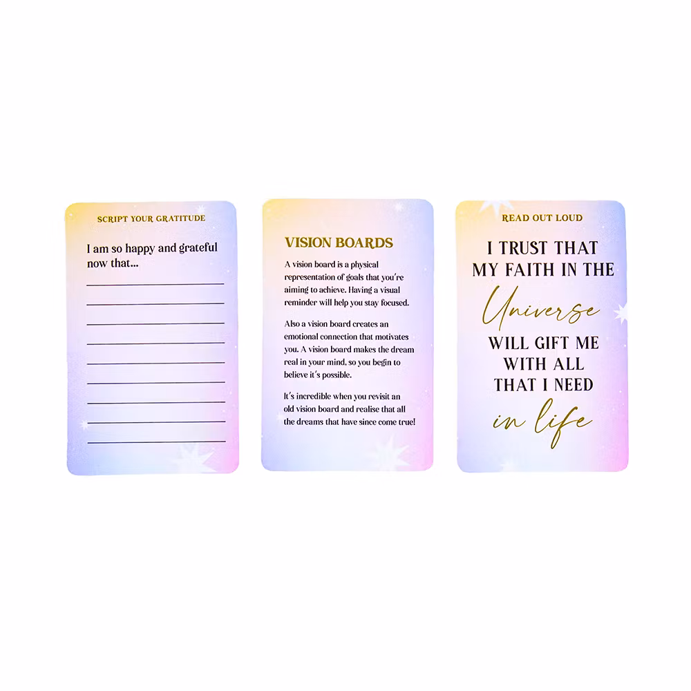 Använd kraften i universum för att få det du vill ha, och lär dig att leva livet som du vill. Det här paketet med kort innehåller 100 tips och tricks för hur du manifesterar ditt drömliv.